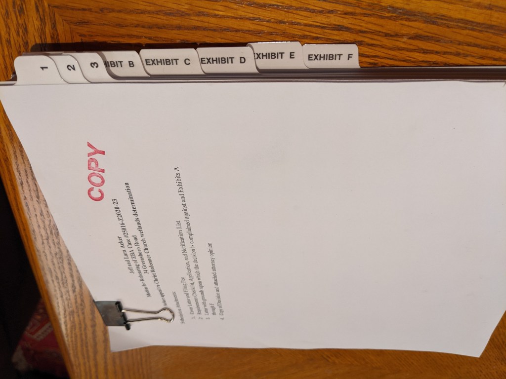 But the fundamental problem with the ZBA decision is that the Board didn’t account for what was in my opinion Houseman’s blatant bias in favor of Christ Redeemer Church and against the Ackers and the Greensboro Rd neighborhood.  For example, when confronted with two contradictory opinions from Certified Wetlands Scientists, Houseman reached out several times for additional information from Audra Klumb, the CWS who represents the church, but never asked for additional information from Rick Van de Poll, the CWS that we hired.  And then (again, of course, in my opinion), during his testimony at the hearing on Jan 28, Houseman blatantly and intentionally misled the ZBA by claiming that he chose to accept Klumb’s report over Van de Poll’s because she had 16 data points in her report and Rick only had 4 in his report.  Now, the number of data points really shouldn’t be the reason to choose one over the other, but it’s worse than that –  Klumb actually only had 3 data points in the information she provided to Houseman!